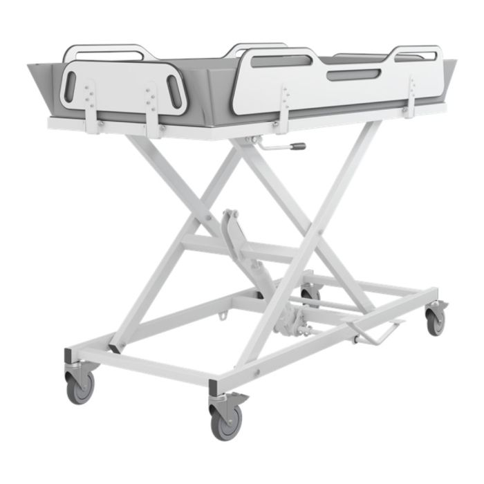 Pressalit MSCT 4 mobile shower changing trolley with hydraulic height adjustment. The trolley is on wheels and can be moved from room to room for easy transport and multiple users. Intuitive, easy-to-use drop down rails with one hand operation. Use the trolley without the mattress for patient hygiene and changing or add the mattress for showering and bed bath operations.