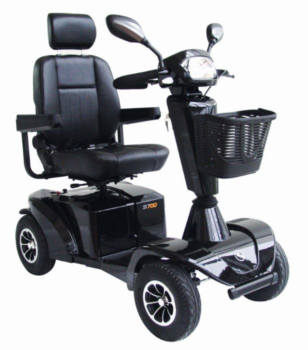 The Sterling S700 is your perfect companion for outdoor adventures. The Sterling S700 is a large, top of the range 8 mph road-ready mobility scooter designed for outstanding performance outdoors. Capable of tackling 10 degree gradients , high kerbs up to 100 mm as well as other road furniture thanks to its larger 33 cm tyres and powerful motors. The S700 is fitted with 2 x 75 amp batteries which are powerful enough to produce an extended range of our up to 34 miles with a top speed of 8 mph. The all round advanced suspension system produces a smooth ride over uneven ground and supports users of up to 160 kg. As with all S Series scooters, the S700 has striking looks thanks to its large centre mounted LED head lights which give great visibility no matter the weather. If you are looking for a large, top of the range road legal 8 mph mobility scooter then the S700 is worth considering as an excellent value option. Why not drop in to our showroom and take one for a test drive today?