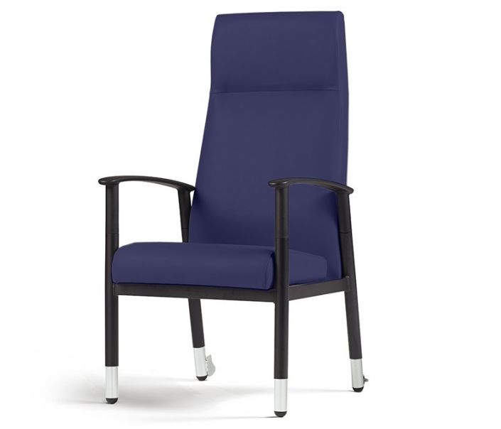 PSTL02QS Tolero patient chair with high back and fixed arms. Available for QuickShip 5 day Express delivery in Panaz Vyflex Plus Navy vinyl, with Onyx black anti-bacterial frame. Tolero is a metal patient chair with full feature set, including removable seat, housekeeping wheels, height adjustable legs, slim contoured profile and infection management features. Designed for use in hospital and healthcare environments.