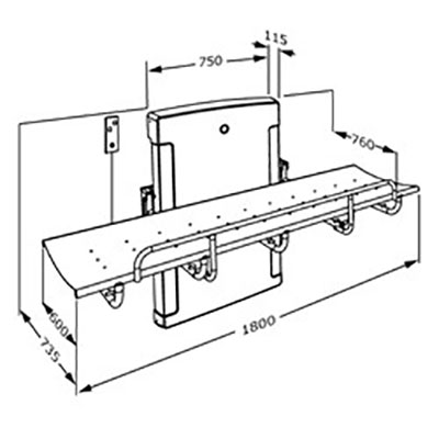 Pressalit 1000 wall mounted changing table. Carers can easily set the height of the table, enabling them to obtain the correct working position. This ensures safe showering and changing for the user as well as minimizing the risk of back injury for the carer. Electric height adjustment with wired hand control – the red buttons clearly indicate “Up” and “Down”. The wired hand control comes with a holder for fitting to the wall. The integrated gas cylinders enable the bench to be folded out of the way when not in use to maximise floor space in front of the unit. Splash curtain (optional) for the nursing bench protects the carer against splashing. The table is made from practical and durable PVC canvas which is phthalate free. The frame is powder-coated steel.