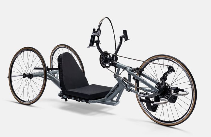 The Top End Force G is he perfect handcycle to Gut It Out! The adjustable, trunk-powered, erect position maximizes your abdominal, arm, shoulder and chest muscle power. Turn fast and smooth with our steering damper system – with 30 speeds and braking at your fingertips. The Top End® Force™ G Handcycle features the adjustable back angle (55°-90°), back height, leg rests, crank height and fore/aft seat position allows you to dial in your ultimate power position. The Force G Handcycle can be considered a cross trainer and is used by athletes classified as an H4 or H5. It’s a great core workout and allows you to see the traffic a bit easier than the recline-only positioned handcycles.