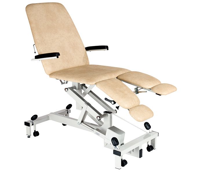 A single motor podiatry treatment chair with a full 90ยบ leg drop and shorter seat allowing unrivalled patient comfort and access. This model features smooth gas strut operated back rest and divided & extending leg rests. The stay level, swing back arm rests are removable to allow multidisciplinary use of the chair in shared clinics. A wide range of options can be added to expand the use of this chair. Standard equipment: UK Manufactured. Lifetime frame & 5 year parts guarantee. 16 year average lifespan. Electric operation. Comfort foam. Easy operation. Low running costs. Hardwearing anti-microbial vinyl. Safe working load 250kg. Retractable castors. Removable fold back arm rests. Divided & extending leg rests. Hoist clearance 130mm. This is a bespoke made to order item which once in production cannot be cancelled and cannot be returned, exchanged or refunded.