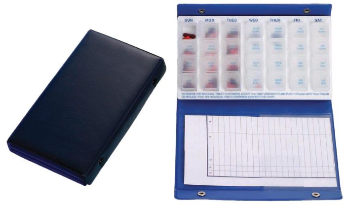 The Week Day Pill Dispenser has 4 compartments per day and comes with a carry case, with space for medication notes. The Week Day Pill Dispenser has a carry case design making it look both modern and professional. Once opened the case has storage compartments for tablets on one side and on the other a sections for making medical notes/reminds. This particular Week Day Pill Dispenser is ideal for those who require more organisation with 4 compartments clearly marked each day.