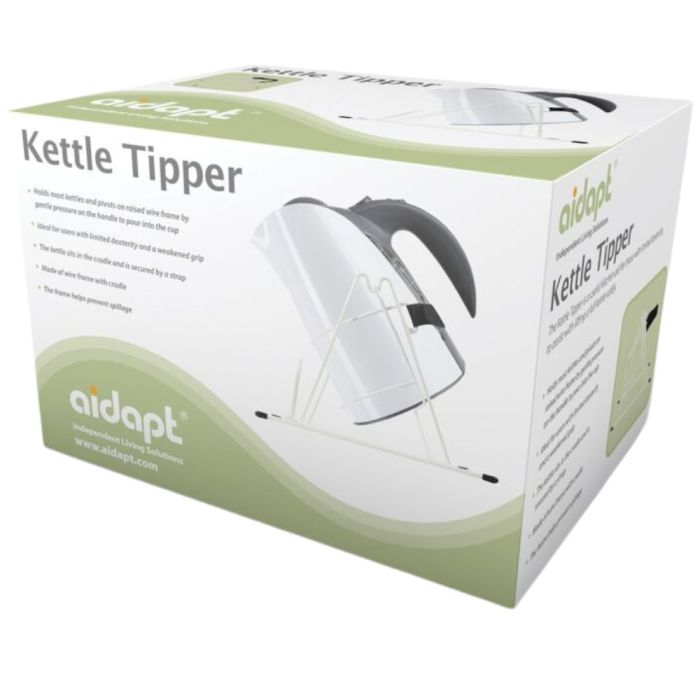 The Kettle Tipper is a useful kitchen aid for those with limited dexterity, to assist with lifting a full kettle safely. The Kettle Tipper has a raised pivot point to prevent spillage (the kettle will return to its upright position if released by the user) and a strap to hold the kettle securely in place. The wire frame of this useful kitchen aid means cups can be placed as near as required to the kettle.