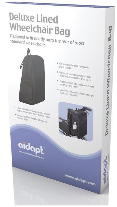 The Deluxe Lined Wheelchair Bag is designed to fit neatly onto the rear of most standard wheelchairs and provides multiple zipped storage spaces ideal for larger or small items. It enables wheelchair users and their carers to safely carry more. The Deluxe Wheelchair Bag is water resistant and features a large zipped top closure for ease of use. The generously-sized main compartment is fully lined and padded.