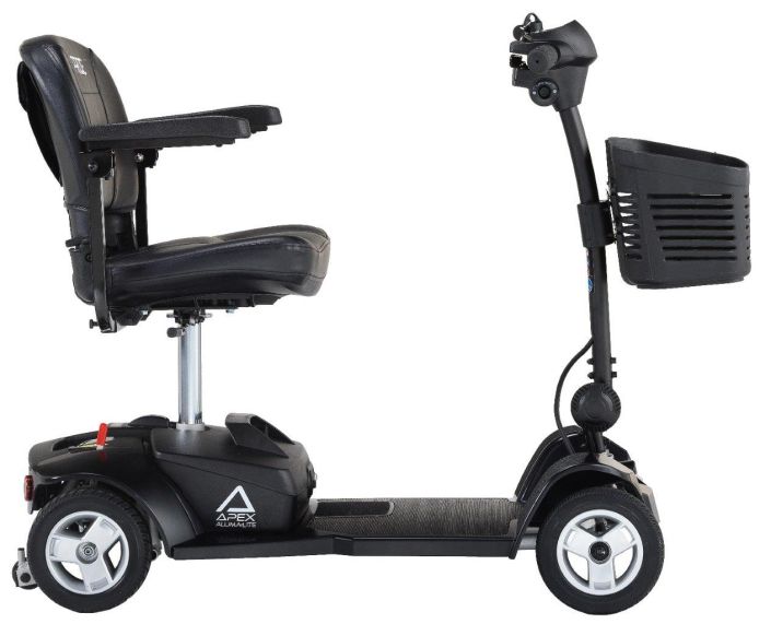 The lightest aluminum travel scooter on the market! Experience the convenience of a lightweight, compact travel scooter. Easy to put into the boot, with its heaviest piece weighing only 11 kg. The Apex Alumalite, with its aluminum frame, weighs only 28.8kg in total making it our lightest four-wheeled scooter yet! Dissassembles into 5 pieces. Airline friendly batteries. Lightweight aluminium frame. 8” alloy style wheels. Easy-to-grip tiller adjustment knob. Spacious foot platform. Additional stability for a more secure ride.Simple and easy to use control system