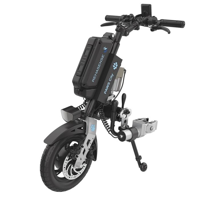 Paws City Wheelchair Power Attachment that clamps onto your manual wheelchair to give you freedom to go anywhere with ease. Paws City can be ordered with a 12" or 14" front wheel. Perfect for urban paths, curbs and great for indoors thanks to its tight turning circle.