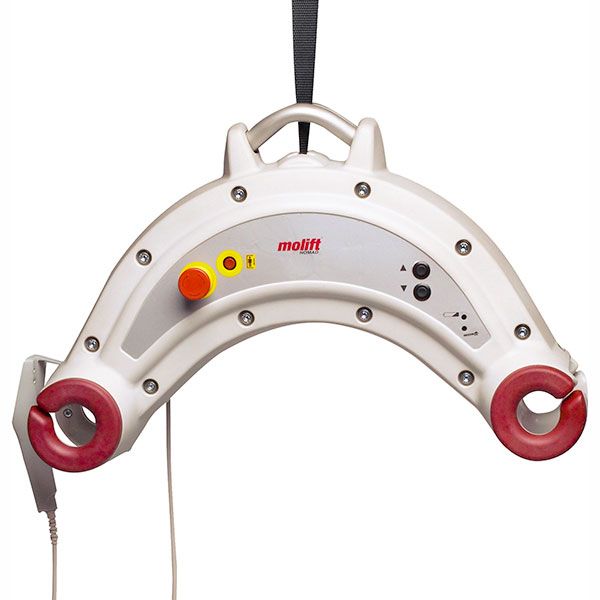 Despite its low weight, Molift Nomad has a hoisting capacity up to 255 kg (562 lbs). The hoist also has integrated carry handles for easy handling. In combination with a specially designed trolley, the Molift Nomad can be used to climb from one rail system to another without a transition rail. This results in easy transfer from room to room.By using the Molift Nomad Extension Arm the Molift Nomad can easily be connected and disconnected by a single caregiver.